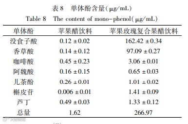 对苹果醋复合饮料及苹果醋饮料中的没食子酸、香草酸、咖啡酸、儿茶酚、槲皮苷、芦丁等单体酚类物质进行测定结果如表8。