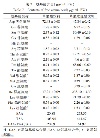 对苹果玫瑰复合果醋饮料、苹果醋饮料中的氨基酸进行测定,结果见表7。