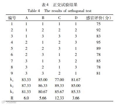 本实验对苹果玫瑰复合果醋饮料配方进行优化,在L9(34)正交试验基础上得到苹果玫瑰复合果醋饮料的较优配方为苹果醋原液添加8 mL/100 mL,玫瑰提取液添加20 mL/100mL,蔗糖添加5 g/100mL,苹果浓缩汁添加量3 g/100 mL。以该配方生产的苹果玫瑰复合果醋饮料产品,按照GB/T 30884-2014的要求进行理化指标、微生物指标的检测,测定结果显示产品理化指标、微生物指标符合国家标准要求。