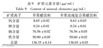 矿质元素是人体必须的常量元素,苹果醋饮料及复合饮料中矿质元素含量结果见表9。