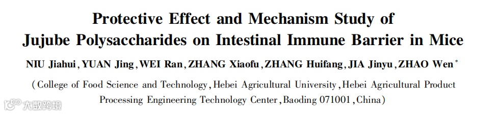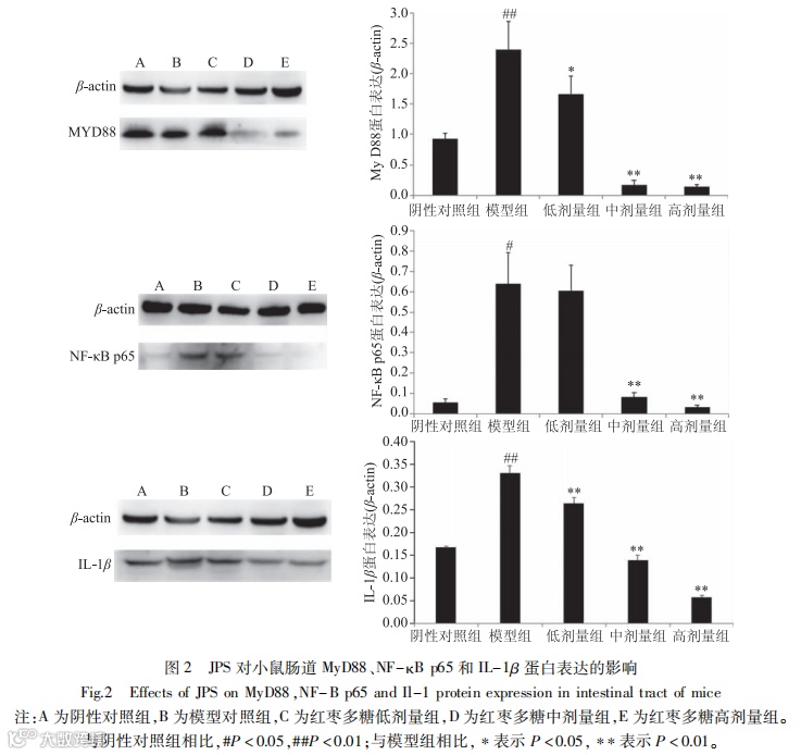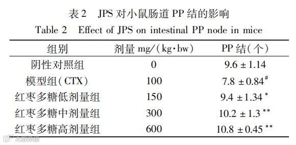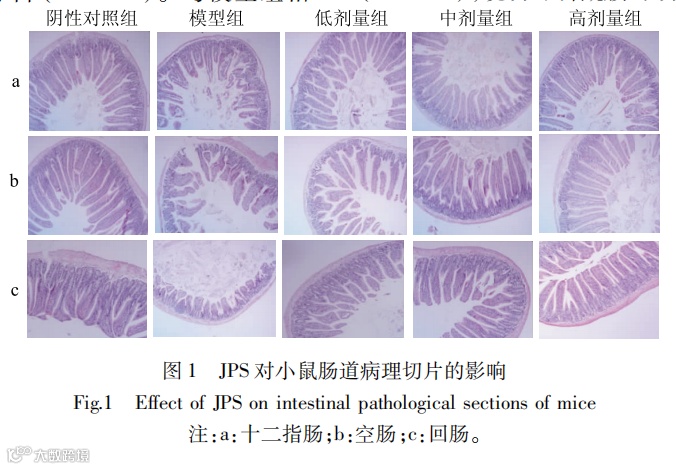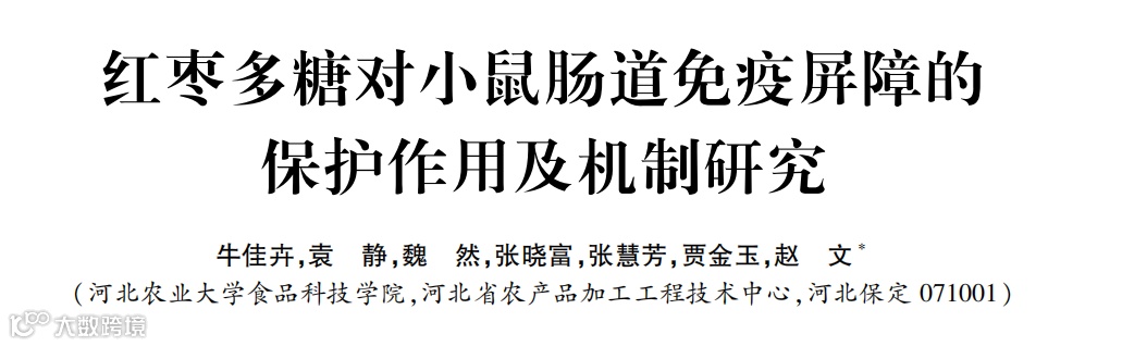 摘要:目的: 研究红枣多糖(Jujube Polysaccharides,JPS) 对小鼠肠道免疫屏障的保护作用及其机制。方法: 将 70 只雄性 ICR小鼠随机分为 5 组: 阴性对照组、模型组、JPS 低(150 mg /kg·bw) 、中(300 mg /kg·bw) 、高(600 mg /kg·bw)剂量组,连续灌胃 28 d,第28 d 采用腹腔注射环磷酰胺造模。研究 JPS 对免疫抑制小鼠免疫器官指数、肠道派伊尔结数量、肠道免疫相关指标、肠道免疫细胞数量和肠道免疫相关蛋白表达的影响。结果: JPS 能够保护小鼠肠黏膜的正常形态结构,增加小鼠免疫器官指数和派伊尔结数量,增加肠道分泌的免疫球蛋白 A 和分泌型免疫球蛋白 A 的含量,增强肠道溶菌酶和酸性磷酸酯酶的活性,增加肠道免疫细胞的数量,下调肠道 MyD88、NF- κB p65、IL-1β 蛋白表达。结论: JPS 对小鼠的肠道免疫屏障具有保护作用,其机制与调节 MyD88 /NF-κB 途径相关蛋白表达有关。