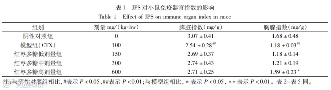 Abstract: Objective: To study the protective effect of jujube polysaccharides extract on intestinal immune barrier and its mechanism in mice. Methods: 70 male ICR mice were randomly divided into 5 groups: negative control group, model group, low (150 mg/kg• BW), medium (300 mg/kg• BW), and high (600 mg/kg• BW) dose group. The mice were gavage continuously for 28 d. To study the effects of JPS on the immune organ index, the number of intestinal Peyer's patches, the intestinal immune-related indicators, the number of intestinal immune cells and the expression of intestinal immune-related proteins in immunosuppressed mice. Results: JPS can protect the normal morphological structure of the intestinal mucosa of mice, increase the index of immune organs and the number of Peyer's knots in mice, increase the content of IgA and SIgA secreted by the intestine, and enhance intestinal lysozyme and acid phosphatase activity, increases the number of intestinal immune cells and down-regulates the expression of MyD88, NF-κB p65, and IL-1β proteins. Conclusion: Jujube polysaccharide extract has a protective effect on the intestinal immune barrier of immunosuppressed mice, and its mechanism is related to the regulation of MyD88/NF-B pathway related protein expression.