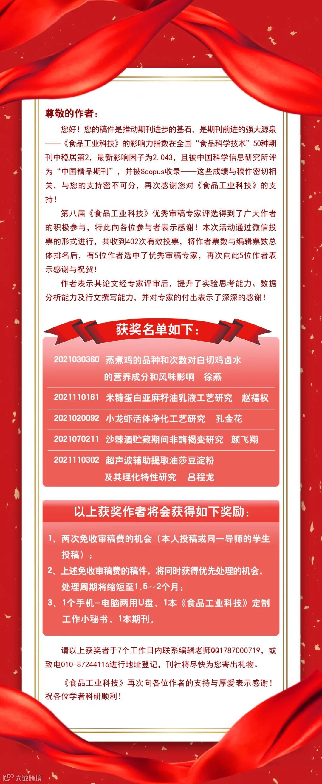 《食品工业科技》第八届优秀审稿专家作者投票活动获奖名单 食品工业科技编辑部