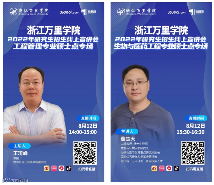 工程管理专业硕士点直播将于8月12日14:00开始直播,主讲人:王琦峰教授,浙江万里学院物流与电子商务学院副院长;生物与医药工程专业硕士点直播将于8月12日15:30开始直播,主讲人:葛楚天,二级教授,博士生导师,浙江万里学院动物性别与发育重点研究所所长、生物与环境学院副院长,国家优秀青年科学基金获得者,浙江省“万人计划”青年拔尖人才。