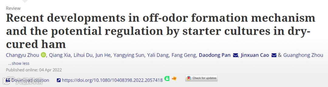 2022年 4月,宁波大学潘道东教授和北京工商大学曹锦轩教授团队在Critical Reviews in Food Science and Nutrition (Q1,IF:11.176)(点击查询食品SCI即时IF)发表题为“Recent developments in off-odor formation mechanism and the potential regulation by starter cultures in dry-cured ham”的综述性论文。宁波大学食品与药学学院青年教师周昌瑜博士为第一作者,潘道东教授和曹锦轩教授为通讯作者。