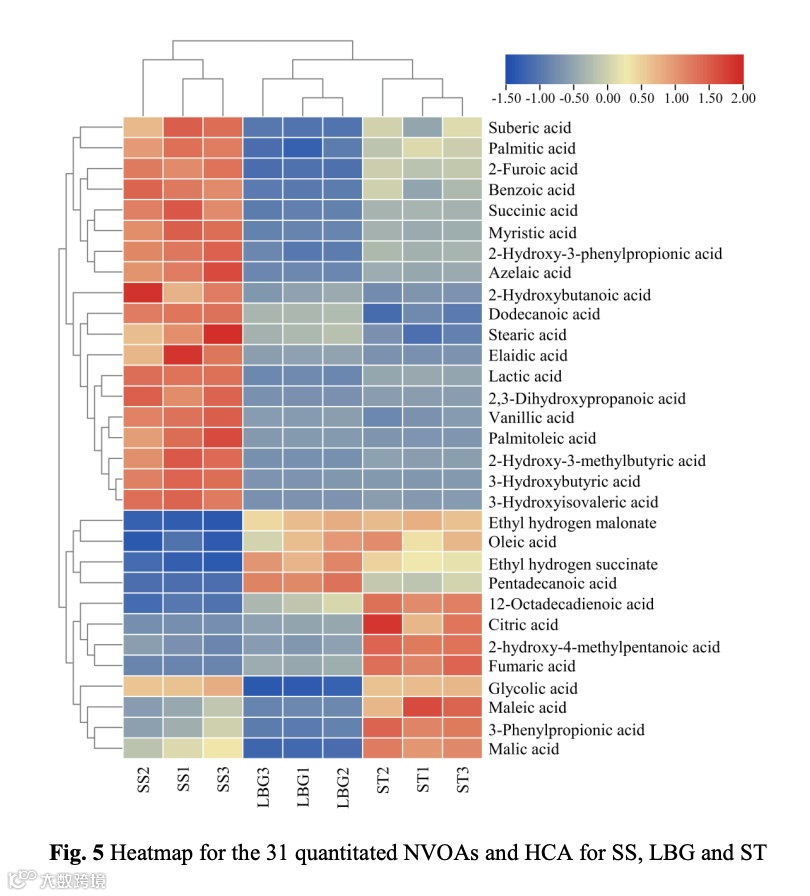 基于所得到的不挥发性有机酸的定性定量数据,使用PCA、Heatmap和HCA成功将3种白酒区分开来,这表明不同香型白酒中的不挥发性有机酸具有较大的差异。该研究提供了一种有效的方法来分析复杂基质食品中的不挥发性有机酸。