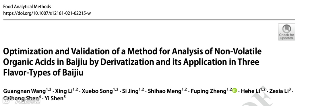 2021年12月15日,北京工商大学:王广南(1作)、李行、宋学博、郑福平*(通讯)等在Food Analytical Methods(IF:3.336)在线发表题为“Optimization and validation of a method for analysis of non-volatile organic acids in Baijiu by derivatization and its application in three flavour-types of Baijiu”的研究文章。