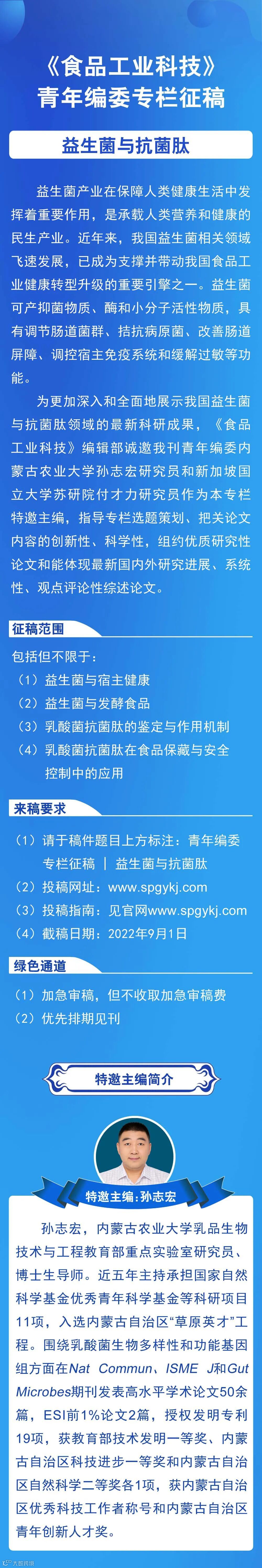快速见刊:“益生菌与抗菌肽”专栏征稿 食品工业科技编辑部