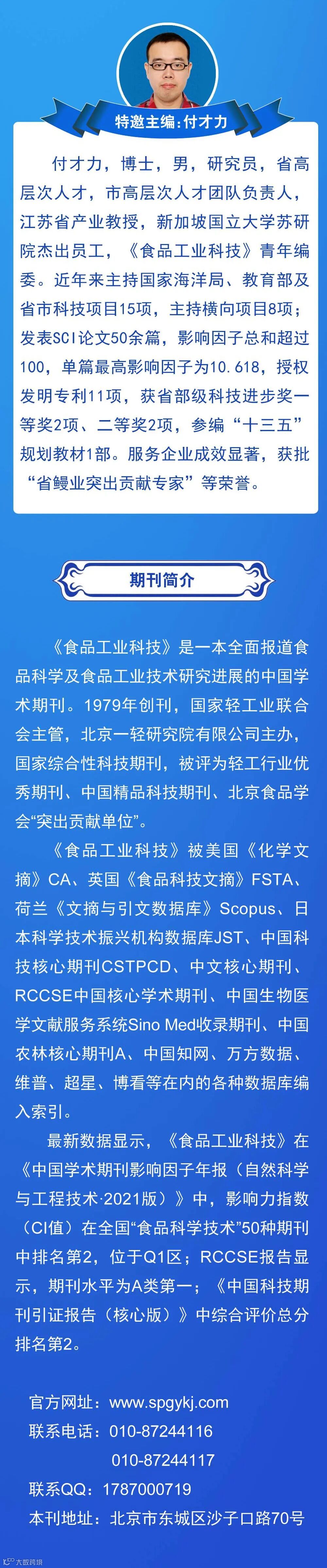 《食品工业科技》编辑部与作者、读者的交流平台。《食品工业科技》既是反映当前国内外食品工业技术水平的窗口,又是新技术应用推广的桥梁,面向科研、生产,满足各层次需求。