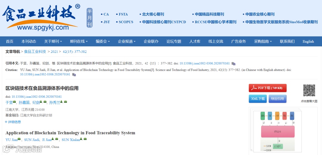 并且,区块链技术创造性地利用一种共同参与者会承认的机制将食品供应链中参与的人员共同加入到对食品产业的溯源体系之中。消费者与食品生产加工企业也逐渐转变为新型的一种不仅仅是传统的购买和贩卖的传统商业关系,更是战略合作伙伴关系。孙秀兰团队主要探究了各种常见食品、药食两用食品行业利用区块链进行溯源体系建设的方法,并探索区块链技术在食品溯源体系建设方面更深层的促进作用,希望能够对区块链技术未来在食品安全方面的产生的应用提供相应的指导意义。