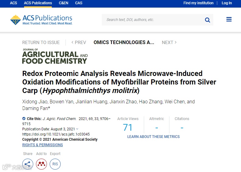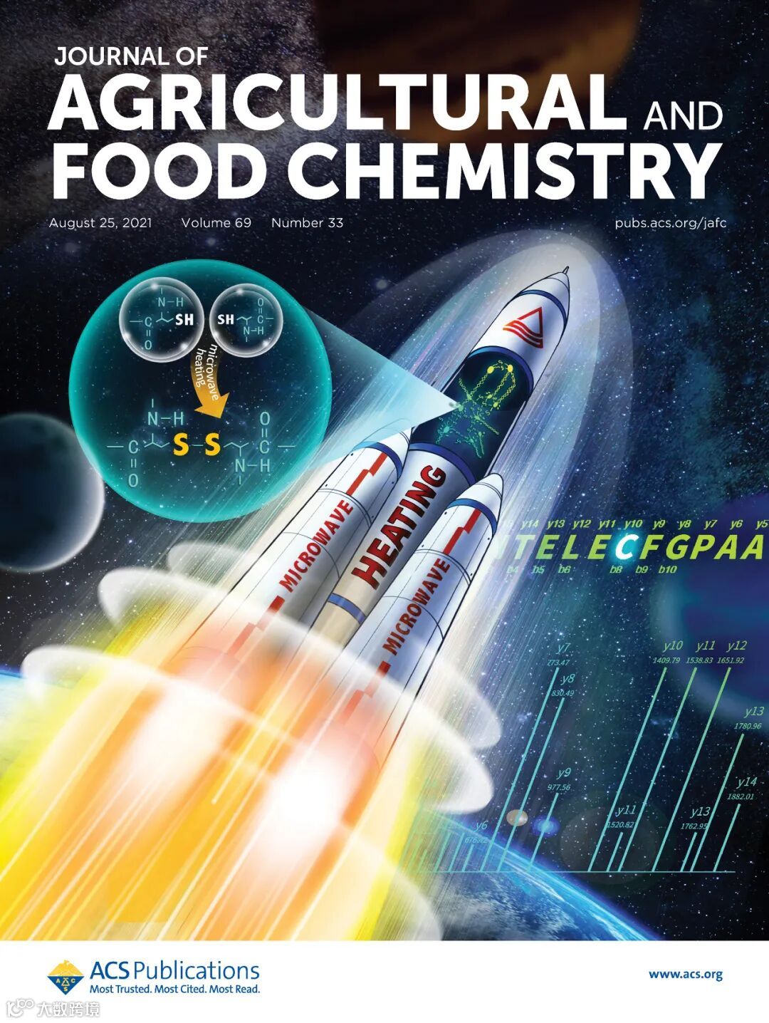 近日,美国化学会期刊《Journal of Agricultural and Food Chemistry》(农林科学领域国际权威Top期刊)在线发表了江南大学食品学院范大明教授题为“Redox Proteomic Analysis Reveals Microwave-Induced Oxidation Modifications of Myofibrillar Proteins from Silver Carp (Hypophthalmichthys molitrix)”的封面论文。范大明教授为通讯作者,博士研究生焦熙栋为第一作者。该研究以肌原纤维蛋白为研究对象,采用iodoTMT同位素标记技术从分子水平上对微波加热过程中整个蛋白质组的变化进行分析,并对关键半胱氨酸氧化位点进行鉴定,揭示了微波场对肌原纤维蛋白的潜在促氧化交联机制。