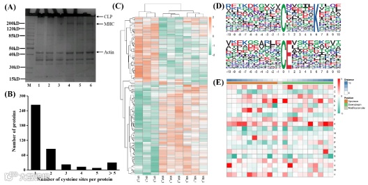 热处理是肌原纤维蛋白凝胶形成的主要手段,本团队前期大量研究基础表明微波加热可靶向改变肌原纤维蛋白分子的构象,干预蛋白分子交联行为,实现蛋白凝胶特性及品质的提升。二硫键是肌原纤维蛋白凝胶形成的主要共价作用力之一,主要是由于肌球蛋白头部的半胱氨酸在热氧化过程中发生氧化,形成二硫共价交联。尽管微波促进肌原纤维蛋白分子间二硫键形成已经被证实,然而,在分子水平上半胱氨酸的氧化修饰位点、数量及氧化水平仍不清楚。该研究基于UPLC-MS/MS的蛋白质组学技术策略,采用同位素iodoTMT进行标记,对肌原纤维蛋白微波加热过程中的氧化修饰进行系统鉴定,利用生物信息学方法对鉴定的蛋白质进行功能注释及聚类分析。结果发现热处理后共有422个蛋白存在表达差异,但微波加热会引起更多蛋白质分子和半胱氨酸位点发生氧化。其中肌球蛋白重链(MHC)、肌球蛋白结合蛋白C、伴肌动蛋白、α-肌动蛋白-3-like和粗丝连接蛋白等关键结构蛋白中的半胱氨酸残基在微波辐射下极易发生氧化修饰,因此肌球蛋白重链的Cys 9可能是蛋白凝胶形成的重要修饰位点。此外,蛋白结构功能注释和功能富集分析表明,与传统水浴加热相比,微波加热在离子结合能力、肌肉细胞发育和蛋白复合物组装等方面存在差异。蛋白-蛋白相互作用分析表明这些结构蛋白与肌原纤维蛋白结构和功能上是相互关联的。这些结果为进一步了解微波物理场对肌原纤维蛋白分子的氧化修饰及其对蛋白凝胶特性提升机制研究提供了理论依据。