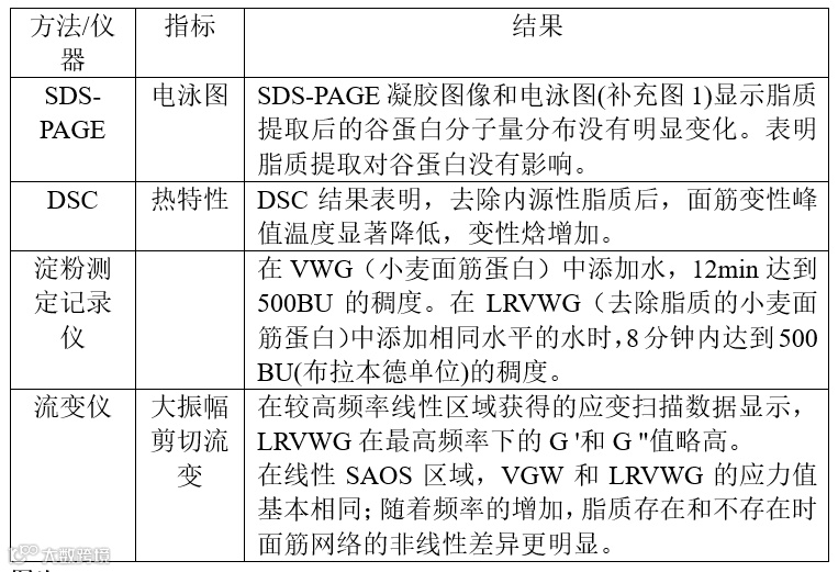 1、淀粉测定记录仪和流变分析等得到结论:内源性脂质对麸质独特的粘弹性特性的贡献。