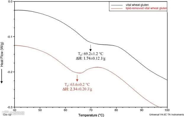 2、流变性、热特性指标分析得到结论:小麦面筋中的内源小麦脂质控制面筋蛋白对水的亲和性,不含脂质的情况下,LRVWG对应变幅度增大和面筋网络纠缠更强的抵抗能力,脂质存在的情况下具有更强的延展性。
