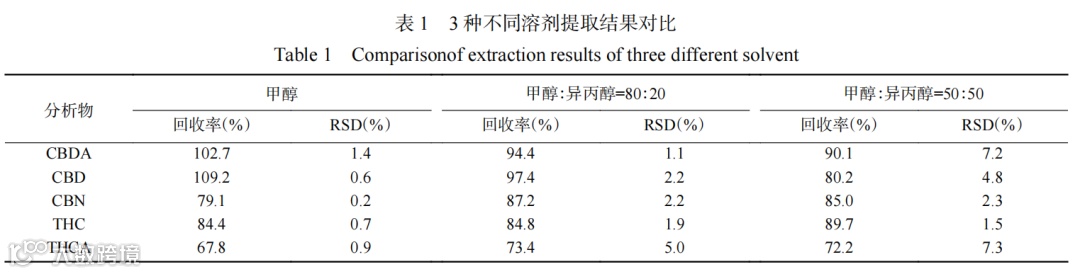 根据5种大麻素的结构、极性、溶解性等性质,选择合适的提取方法和提取溶剂是检测的重要前提。有较多文献选择使用甲醇作为提取溶剂,提取火麻油中的大麻酚类物质。考虑到异丙醇可以和水、脂肪类化合物以及较多有机物都有较好的互溶,并且其闪燃点、爆炸极限等安全性能都较好,对环境和人体健康影响较小,常被用于植物提取物的提取。