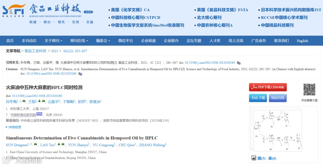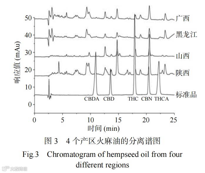 为了发展一个标准化的、普适性好的火麻油中THC、THCA、CBD、CBDA、CBN等大麻素的检测方法,兰韬团队广泛采集了国内山西、广西、陕西、黑龙江4个不同产地的火麻油,并根据不同产地火麻油基质的特点,通过优化前处理条件和色谱条件,发展了一种普适、简单、稳定、准确的火麻油中五种大麻素的检测方法,并通过方法学验证,实现检测方法的标准化,为相关产品的质量控制奠定基础。