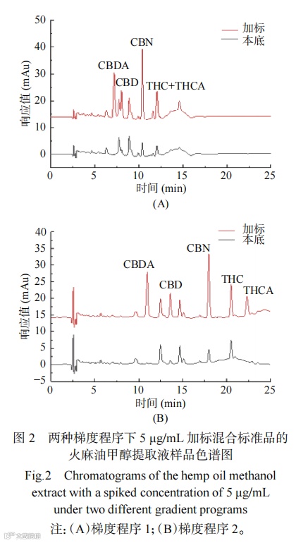 为尽可能的将待测的五种大麻素类物质与火麻油中的基质成分的分离,首先对流动相梯度程序进行了优化。以山西火麻油的甲醇提取液为本底溶液,向其中添加了5 μg/mL混合标准品,采用两种不同的流动相梯度程序对本底液和加标液分别进行了色谱分离,两种流动相梯度程序分别为:程序1:0~20 min,80%B~90%B; 20~22 min, 90%B; 22~24 min,90%B~80%B; 24~30 min,80%B。程序2:0~20 min,70%B~90%B; 20~22 min,90%B; 22~24 min, 90%B~70%B; 24~30 min,70%B。分离结果如图2所示,并通过单标法对峰的归属进行了确证。结果表明在梯度程序1下CBD无法与火麻油基质成分分离,THC和THCA分离度较差。而经过降低初始有机相的组成,在梯度程序2下,火麻油中各个峰分离情况较好,且基质中杂质峰和待测的五种大麻素的色谱峰没有相互掩盖,所以后续实验都采用梯度程序1进行实验优化和方法验证。并且从图2可以看出,通过调整流动相的比例,改变洗脱条件,能够实现将基质中杂质峰与被分析物色谱峰分离的效果,降低了杂质峰干扰的可能,从而省去对提取液进行净化处理的步骤,使得操作简便、耗时较短。