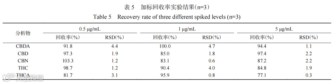 在陕西产的火麻油实际样品中添加0.5、1、5 μg/mL的低、中、高三种浓度水平的大麻素混合标准溶液,用本实验方法进行测定,并计算回收率,结果如表5所示。由表中数据可知,5种大麻素的回收率在77.1%~103.3%,相对标准偏差RSD≤4.7%,表明本方法回收率好,结果准确可靠。
