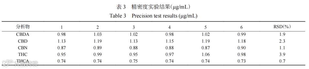 按照上述实验步骤,在1 d内平行测定6次1μg/mL的混合标准溶液,测得的CBDA、CBD、CBN、THC、THCA五种大麻素的浓度与RSD如下表3所示。由上表数据可知,精密度实验结果RSD在0.7%~3.9%之间,表明仪器精密度良好,使用该仪器进行检测,可以保证方法的结果准确。