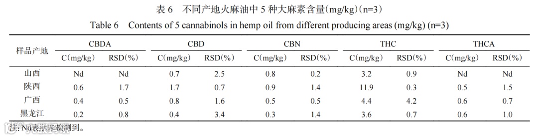 以本方法的提取工艺和色谱条件对广西、黑龙江、山西、陕西4个产地的火麻油样品进行了分离分析,结果如图3所示。从图中可以看出,4个产地的火麻油中均或多或少的存在一定量的5种大麻素, 这5种大麻素与基质中的其他物质实现了良好的分离,不影响这5种大麻素的定量分析。对山西、广西、陕西、黑龙江4个不同产地的火麻油中5种大麻素含量进行计算,计算结果见表6。实际样品分析结果表明,除山西火麻油中不含CBDA和THCA外,陕西、广西、黑龙江等3个产地的火麻油中5种大庥素都有检出,且具有成瘾性的THC的含量均>3.2 mg/kg,其中陕西火麻油中THC含量甚至高达11.9 mg/kg。