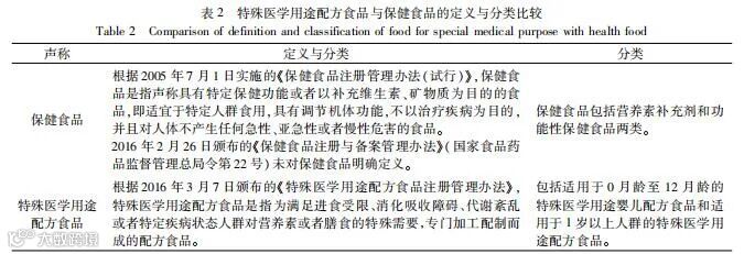 表2对特殊医学用途配方食品与保健食品的定义与分类进行了比较。由此可以看出,保健食品按产品种类分类,而特殊医学用途配方食品可以按产品适用人群的年龄分类;而在定义上,保健食品是用于补充特定营养或调节机体功能,特殊医学用途配方食品则是为了满足特定人群的特殊营养需要,二者存在本质上的不同。