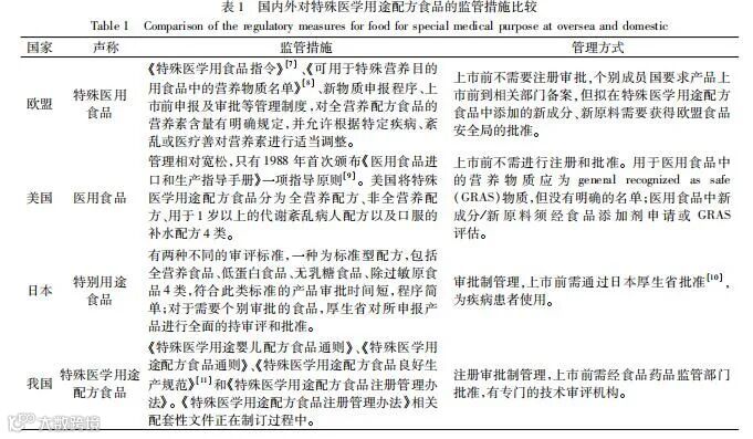 目前《特殊医学用途配方食品注册管理办法》的相关配套性文件正在制订过程中,《特殊医学用途配方食品注册申请材料项目与要求(征求意见稿)》、《特殊医学用途配方食品标签、说明书样稿(征求意见稿)》、《特殊医学用途配方食品临床试验质量管理规范(征求意见稿)》、《特殊医学用途配方食品稳定性研究要求(征求意见稿)》及《特殊医学用途配方食品注册生产企业现场核查要点及判断原则(征求意见稿)》5个配套文件,国家食品药品监督管理总局已于2016年4月15日面向社会各界公开征求意见。各国对特殊医学用途配方食品管理措施比较见表1。
