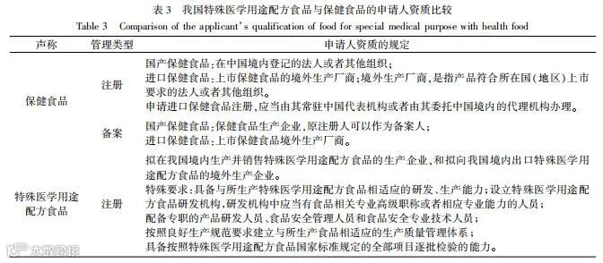 表3列举了我国特殊医学用途配方食品与保健食品的申请人资质比较。由此可见,注册特殊医学用途配方食品的申请人只可以是生产企业,并且对申请的企业提出了明确要求:有与申请产品相适应的研发、生产能力,并且必须配备从研发到生产、管理各领域各环节的专业人员和严格的监管体系,对研发机构的人员也提出了明确的资质要求。而在中国境内登记的法人或者其他组织和境外生产厂商,均可申请注册保健食品,保健食品注册申请人条件要求的宽泛致使各行业人员均可快速转型进入这一领域。因此,特殊医学用途配方食品的注册管理,对注册申请人要求要较保健食品严格。