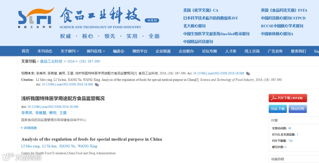 目前,在许多发达国家该类产品均已得到广泛使用与认可,并作为一种特殊膳食用食品管理。在过去的三十年特殊医学用途配方食品在世界各国的应用也越来越广泛,特殊医学用途配方食品产业在世界呈蓬勃发展之势,全世界每年消费特殊医学用途配方食品约560—640 亿元,但长期以来,我国特殊医学用途配方食品一直采用药品审批制度,严重制约了该类产品的使用与发展,该类产品的市场规模很小,总量不足6 亿元,不能满足实际临床需要。2015年新修订的《食品安全法》,将特殊医学用途配方食品列为特殊食品,由食品药品监管部门实施严格监管。在此要求下,2016年3月7日《特殊医学用途配方食品注册管理办法》出台,我国特殊医学用途配方食品开启由“药品”转为“食品”的监管之路。李美英团队在归纳国外对特殊医学用途配方食品监管制度的基础上,解析我国对这类食品监管的新要求,比较“特殊医学用途配方食品”与“保健食品”这两类特殊食品的异同,分析制约我国特殊医学用途配方食品发展的因素,展望我国特殊医学用途配方食品的发展趋势。