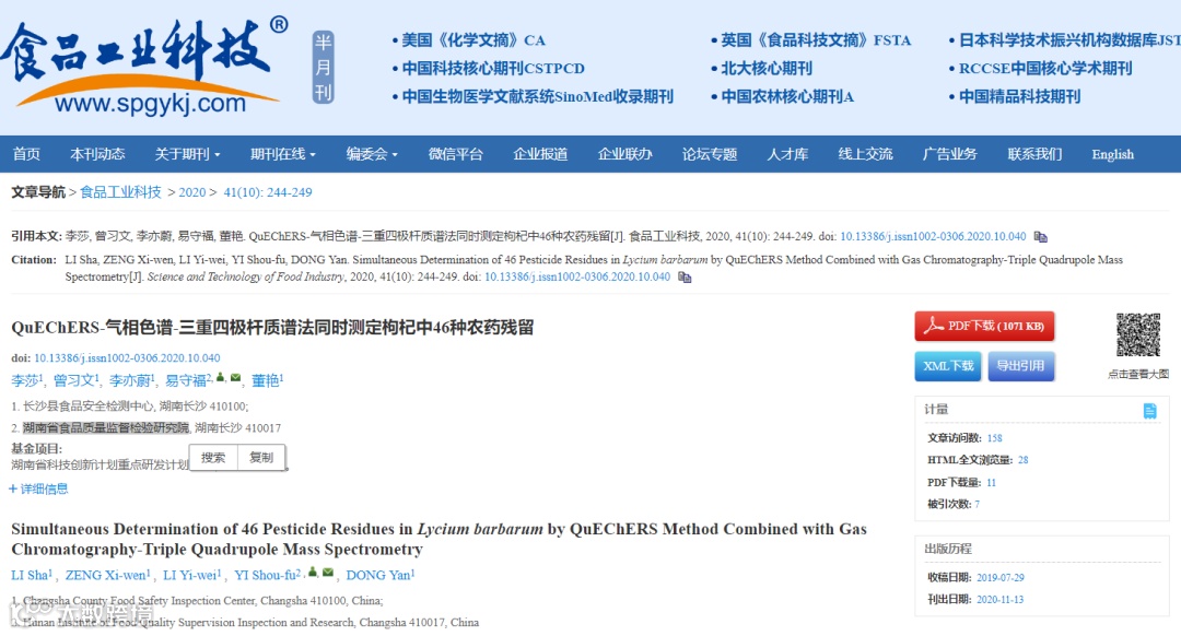 [7]李莎, 曾习文, 李亦蔚, 易守福*, 董艳. QuEChERS-气相色谱-三重四极杆质谱法同时测定枸杞中46种农药残留[J]. 食品工业科技, 2020, 41(10): 244-249.