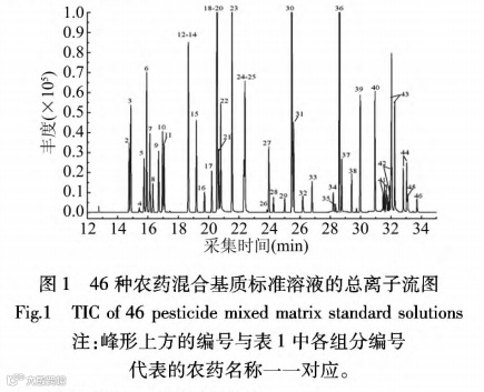 气相色谱一三重四极杆质谱法检测100 ng/mL 氧乐果等46种农药化合物基质混合标准溶液,所得总离子流图如图1所示。
