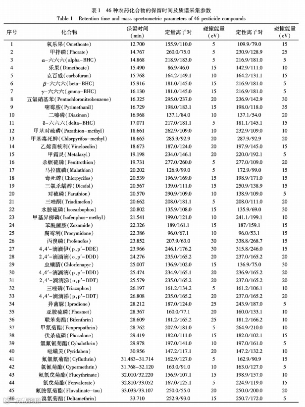 分别对46种农药化合物进行全扫描,选择2~3 个特征且丰度高的离子作为母离子。再分别对每个母离子进行子离子扫描,设定碰撞电压在5~35 eV之间,每隔5 eV进行1次碰撞优化碰撞能量,择优选取强度和信噪比兼顾的离子对分别作为定量和定性离子对。本文选用Agilent HP一5MS柱,在分离过程中采用程序升温可有效地改善峰形,通过分段离子扫描可有效提高仪器检测灵敏度。经过优化,46种农药残留组分多反应监测模式条件及保留时间如表1所示。