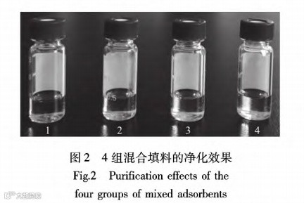 本实验以2 mL离心后的 100 μg/kg加标标样品提取液为研究对象,对MgSO4、 PSA、GCB、C18。的种类和用量进行优化。对比4种净化管(填料配比详见1.1)的净化效果,结果表明,随着填料种类的增加,净化液越来越澄清(图2),说明净化效果越好,表明PSA、C18和GCB在枸杞前处理过程中都发挥了相应的除杂效果。同时,对4组填料下46种农药的回收率进行比较,发现含150 mg无水硫酸镁、50 mg PSA的净化剂(2号净化管)不仅可以将枸杞样品中的杂质净化,且对目标农药的吸附少,各农药组分的平均回收率最高,均在80%~100%范围内。这是因为枸杞中主要含多糖类、胡萝卜素、纤维素等营养成分,PSA可将其有效吸附;C18和GCB的加入虽对色素去除更彻底,但也对极性较弱和平面结构的农药有较强的吸附作用,使目标组分的回收率降低。因此,本方法优先采用2号净化管 (含150 mg MgSO4,50 mg填料)对枸杞提取样液进行净化处理。