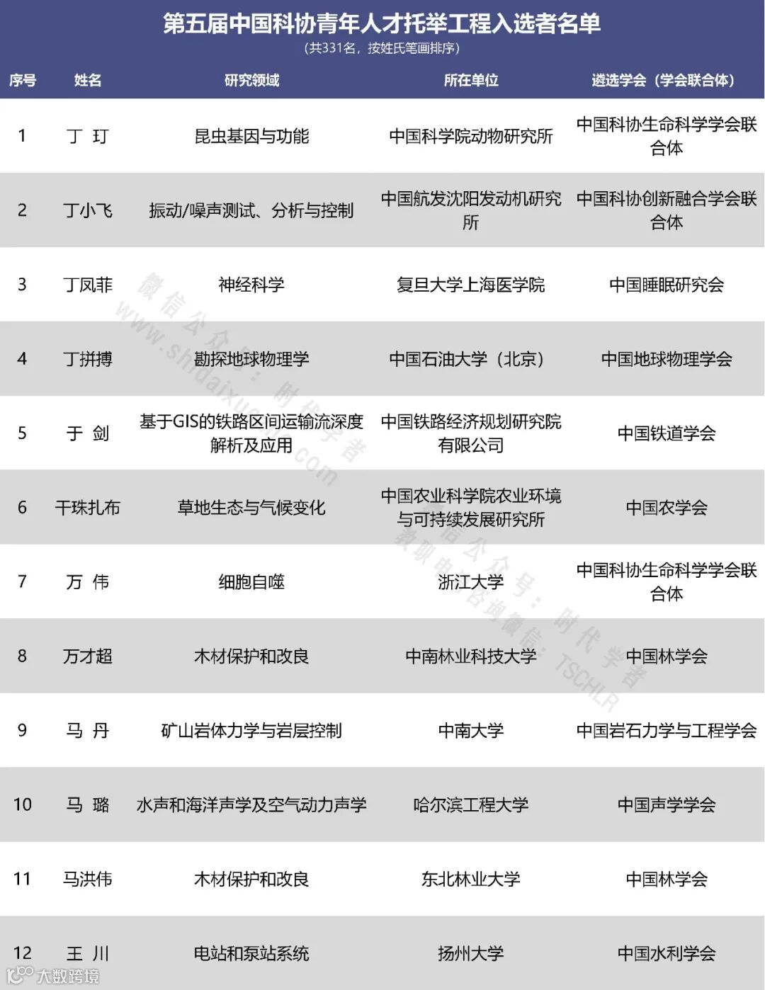 根据《中国科协青年人才托举工程管理办法》《中国科协青年人才托举工程实施管理细则》和《中国科协办公厅关于开展第五届中国科协青年人才托举工程项目申报工作的通知》要求,经专家推荐、项目实施单位遴选、人选公示等程序,确定丁玎等331名青年科技工作者入选第五届中国科协青年人才托举工程(不包含特殊科技领域入选者)。现将以上入选者名单予以公布。