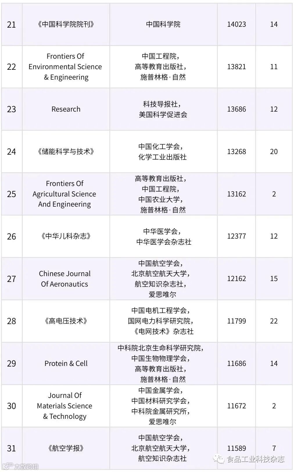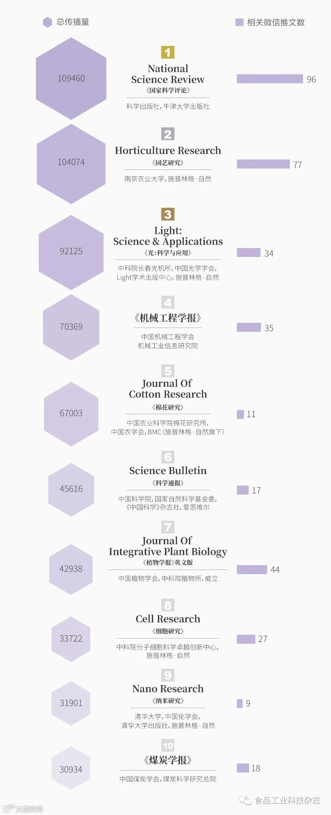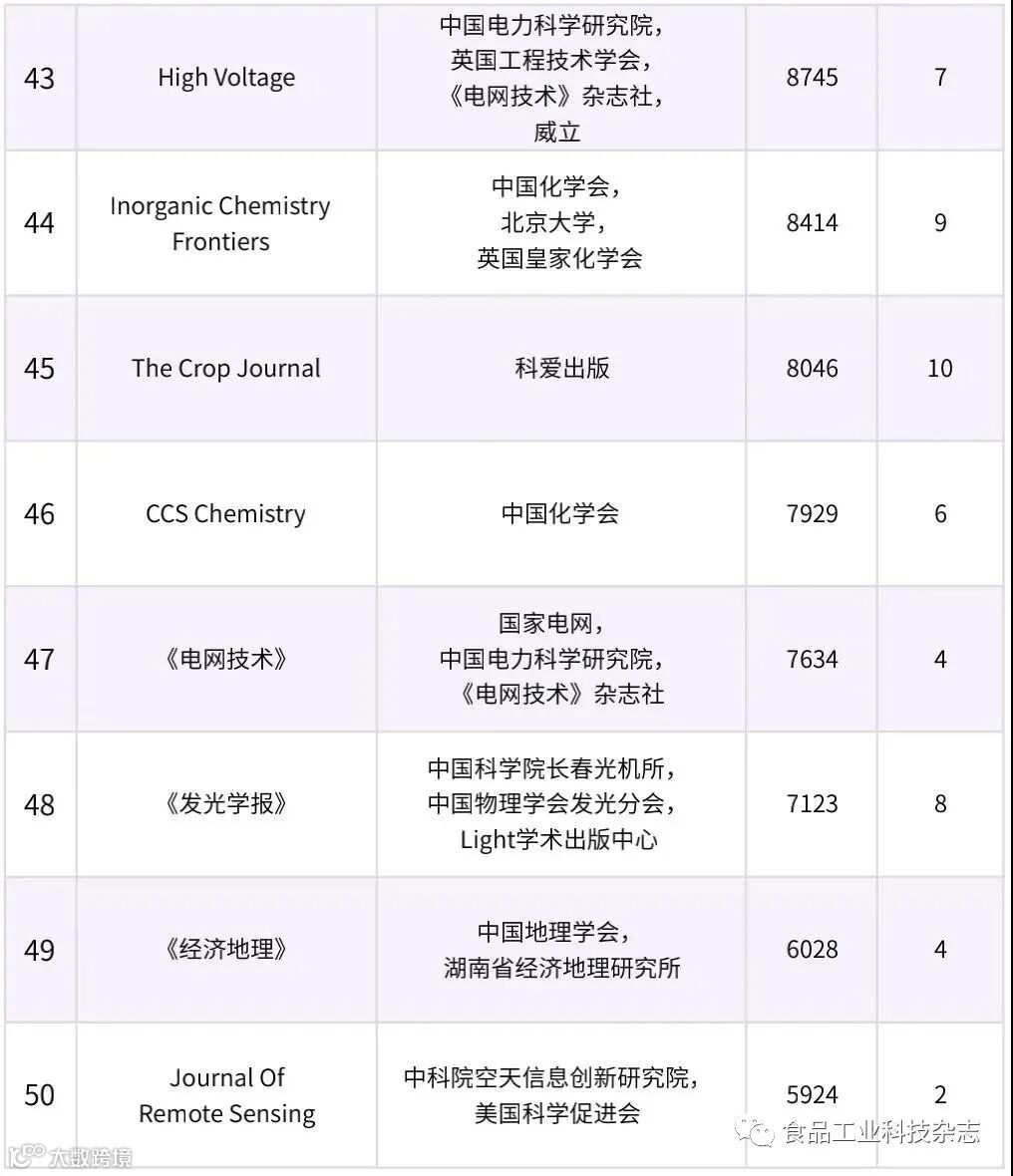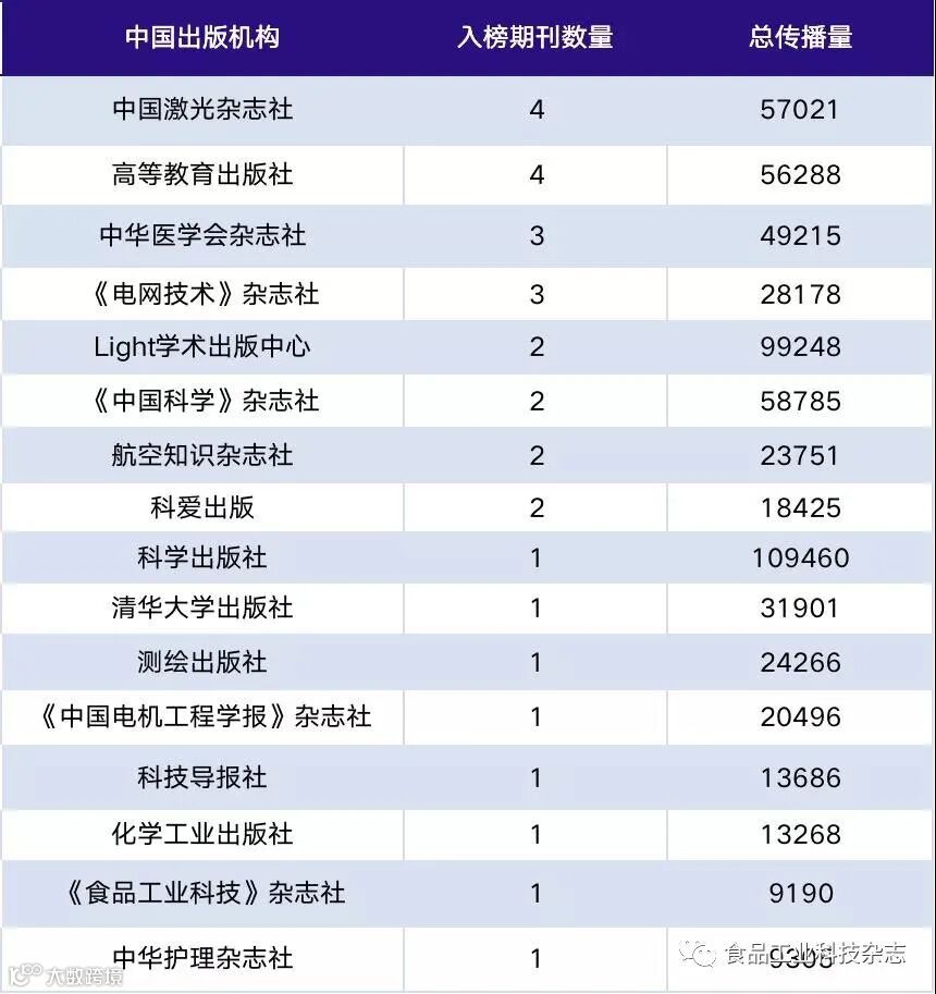 在众多出版机构中,《食品工业科技》杂志社以“食品工业科技杂志”作为入榜期刊,证明了我刊在数据传播方面的实力。