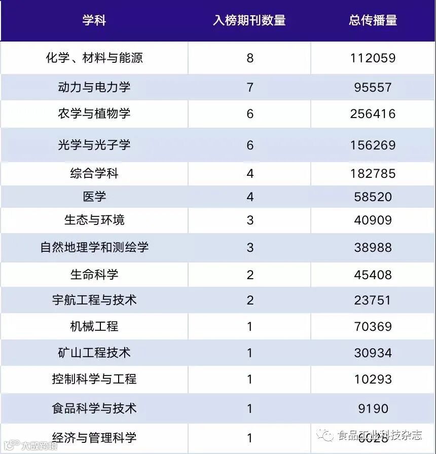 在所有学科中,“食品工业科技杂志”是唯一入选“食品科学与技术”学科的微信公众号。