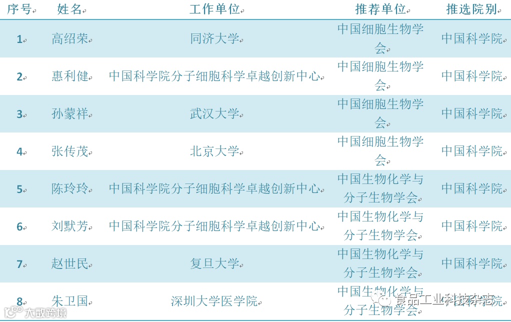 截至目前,各食品、生物学会拟推荐两院院士候选人名单如下(不完全统计):