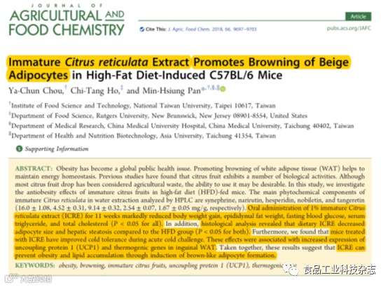先前的一项研究指出,未成熟的柑橘比其他许多不同的柑橘品种含有更多的辛弗林素、诺比林和橘皮素。因此,柑橘幼果提取物(Immature Citrus reticulata extract, ICRE)作为减肥膳食补充剂的来源具有很好的潜力。