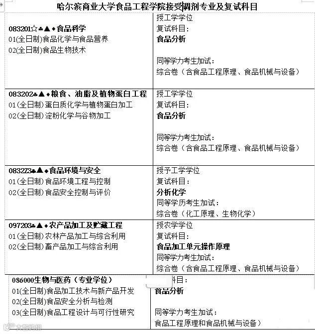 哈尔滨商业大学食品科学与工程学科创建于1958年,1982年开始研究生培养,2006年获食品科学二级学科博士学位授予权。学科现有“食品科学与工程”一级学科博士授权点1个、“食品科学与工程”一级学科硕士授权点1个、“食品环境与安全” 二级学科硕士授权点1个及工程硕士(生物与医药领域)专业学位授权点1个。食品科学学科先后被原国内贸易部(1996)和黑龙江省(2001)评定为省部级重点学科;食品科学与工程一级学科2011年被评定为“十二五”黑龙江省重点学科。