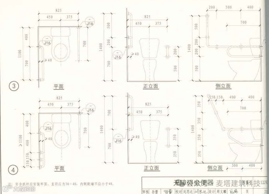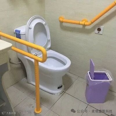 8、便器旁、淋浴区应设置助力扶手,扶手颜色应与卫生间墙面颜色对比明显。如下图