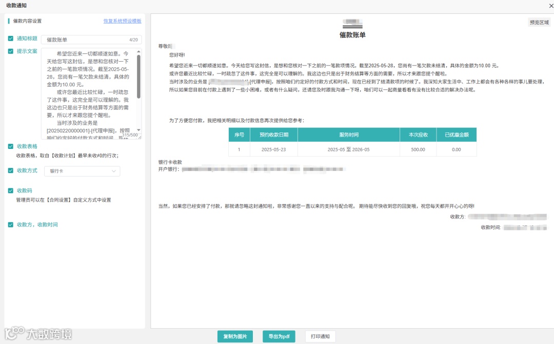 3.要收费?点“收费”直接填支付信息;要催款?点“催费账单”,自动生成PDF/图片,发客户超正式,不用自己写催款函!