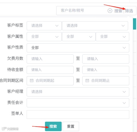 2.想找“欠费超30天、待收超5000元”的客户?点“筛选”,选客户属性、欠费区间、责任人,10秒定位目标;