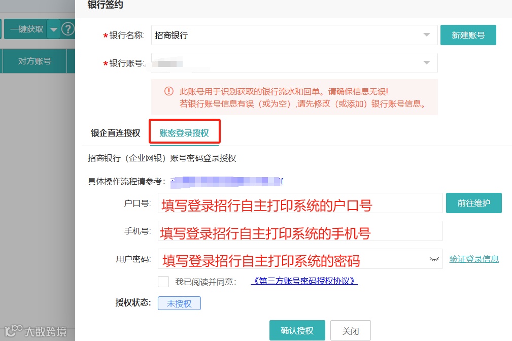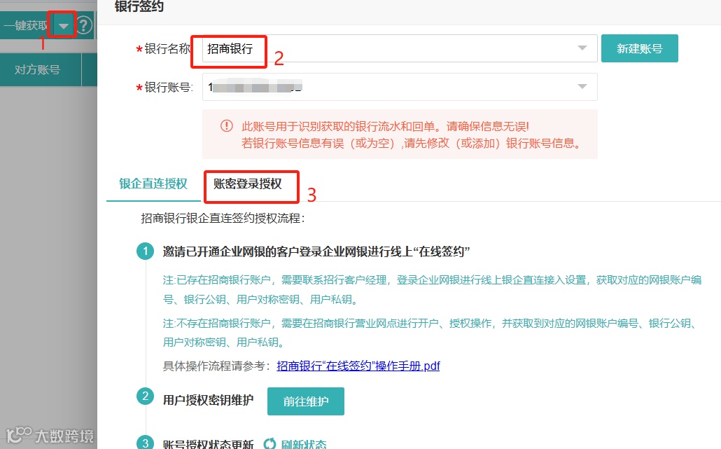 1.打开【云财务→票据→银行流水→更多→银行签约】(或【慧代账→数据准备→采集理票→银行单据→一键获取→银行签约】),选“招商银行”,系统自动带出已添加的账号。