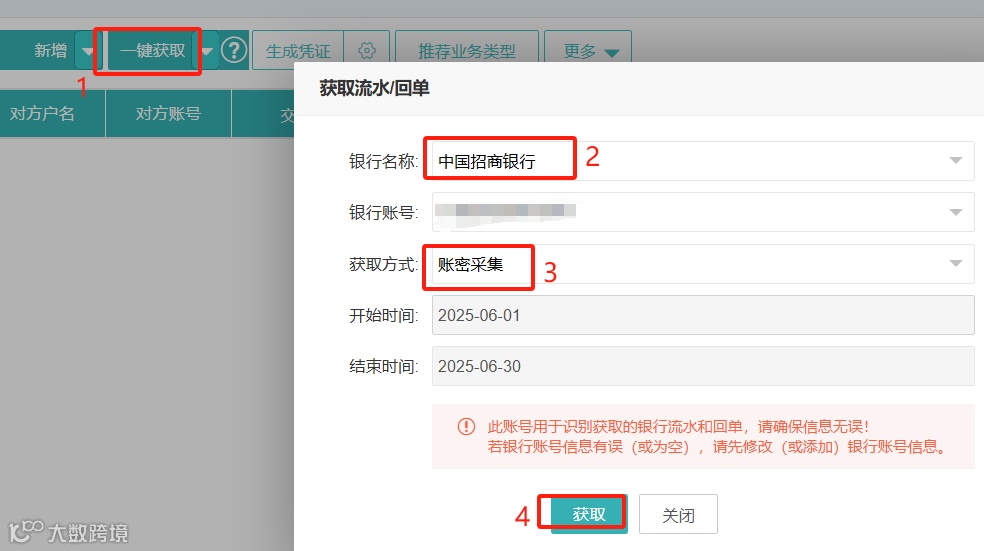 1.同上路径进入“一键获取”,选好会计区间(比如2025.6.1-6.30)