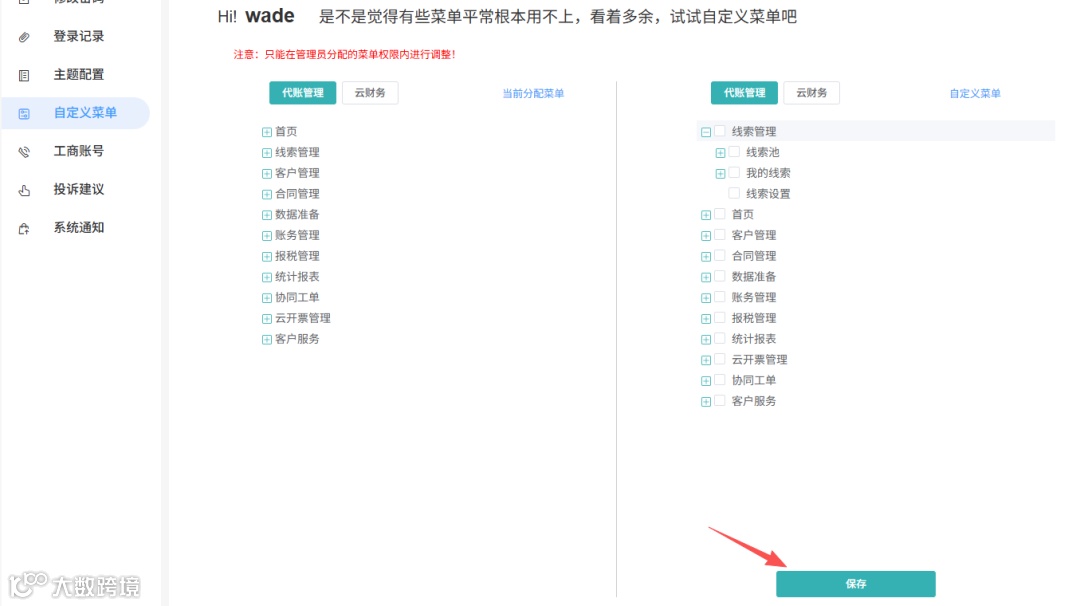 左侧是管理员给的所有权限菜单,右侧是你的专属区域:常用的“客户管理”“报税管理”勾选显示,用不上的“测试菜单”直接取消,界面瞬间清爽。(预计10月上线切换功能)
