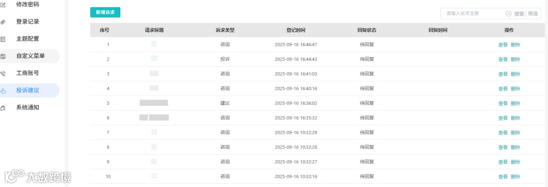 历史诉求全可见:标题、类型、回复状态清清楚楚,还能删、能查详情