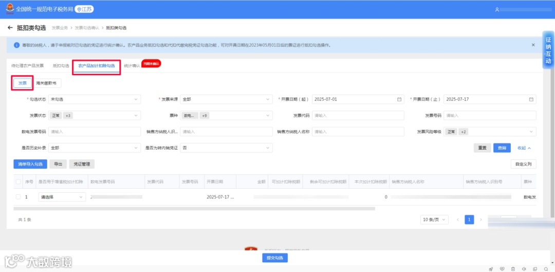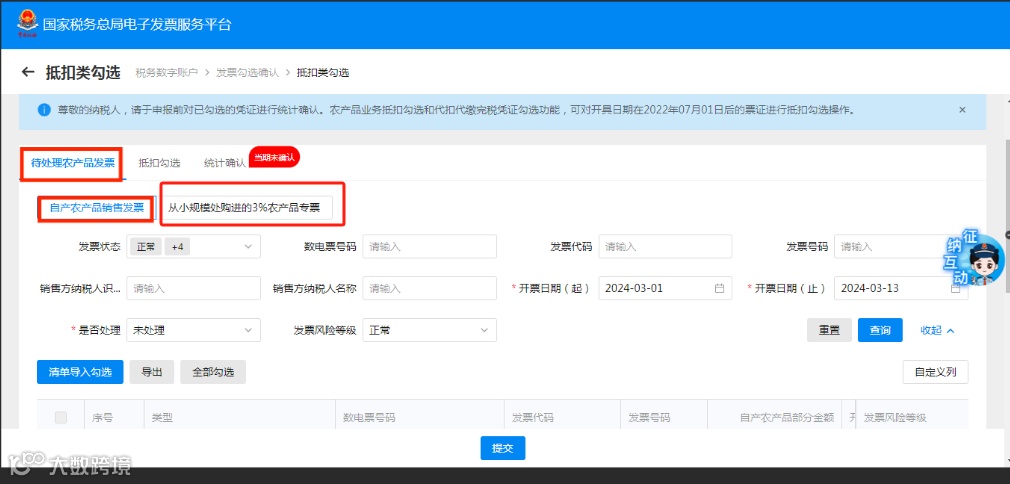 2.自产农产品销售发票(从税控系统获得的普票),从小规模处(自产或流通)购进的3%农产品专票,需要在【待处理农产品发票】-【自产农产品发票】模块功能处理后再进行勾选,如下图所示: