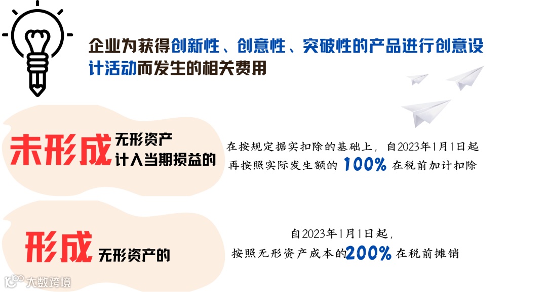 2.企业为获得创新性、创意性、突破性的产品进行创意设计活动而发生的相关费用,未形成无形资产计入当期损益的,在按规定据实扣除的基础上,自2023年1月1日起,再按照实际发生额的100%在税前加计扣除;形成无形资产的,自2023年1月1日起,按照无形资产成本的200%在税前摊销。