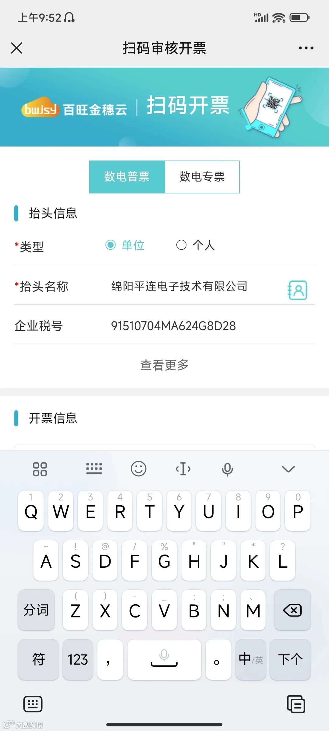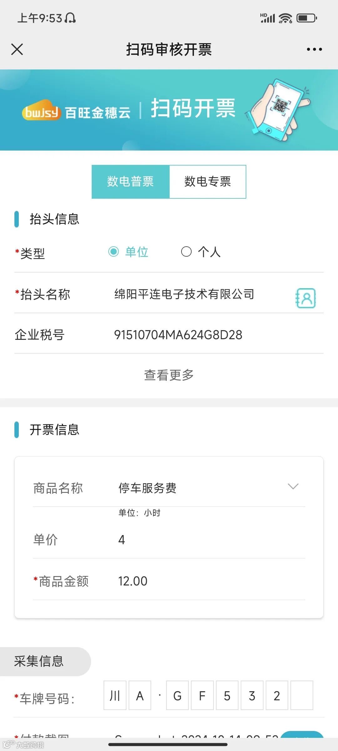 您只需使用百旺金穗云软件提供的开票二维码,张贴在停车场门口,顾客付款后出场扫码,简单填写抬头信息、金额、车牌号、以及收票信息,直接点击确认开票。
