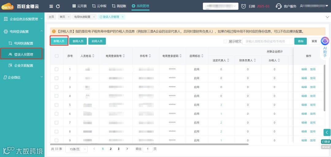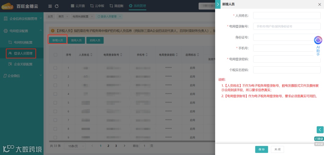 添加登录人员信息后,系统会自动关联电子税务局的登录密码和个税实名密码,确保授权登录流程顺畅无阻。
