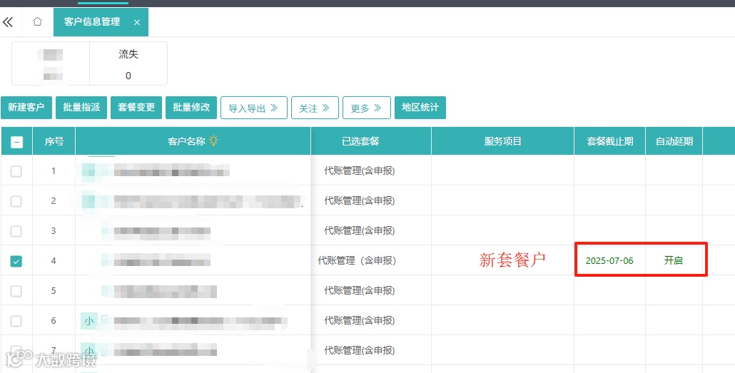 新套餐客户在“套餐截止期”“自动延期列”会有数据展示,默认自动延期关闭。